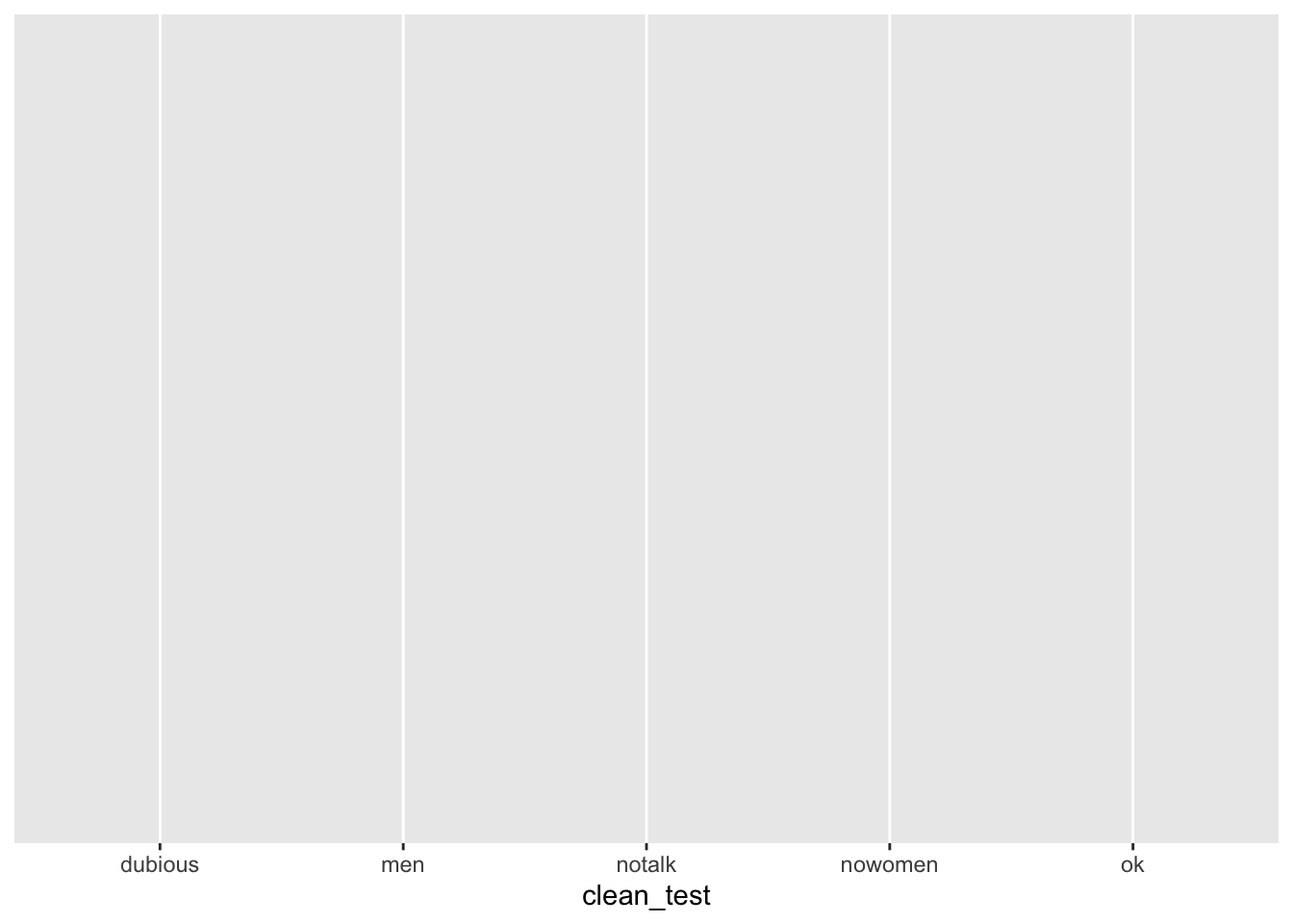 ggplot()creates the initial base coordinate system, and we will add layers to that base. We first specify the data set we will use withdata = bechdel.