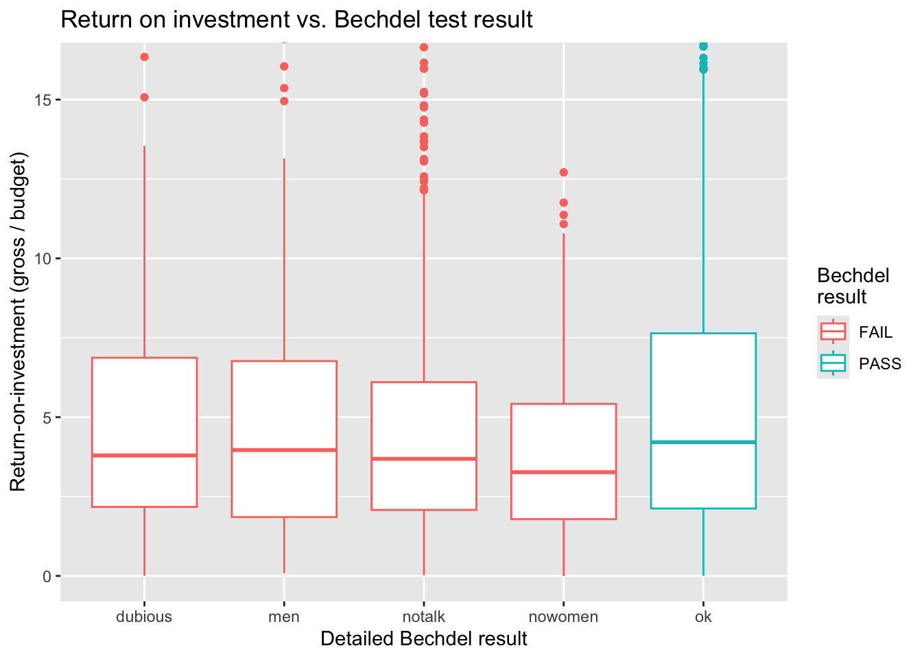 Let’s take a look at return-on-investment (ROI) for movies that do and do not pass the Bechdel test.