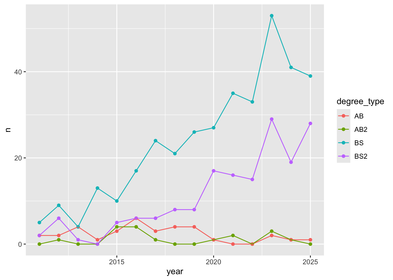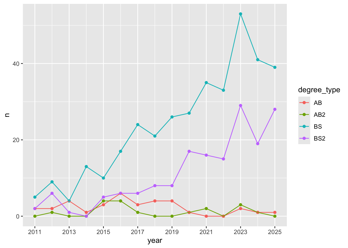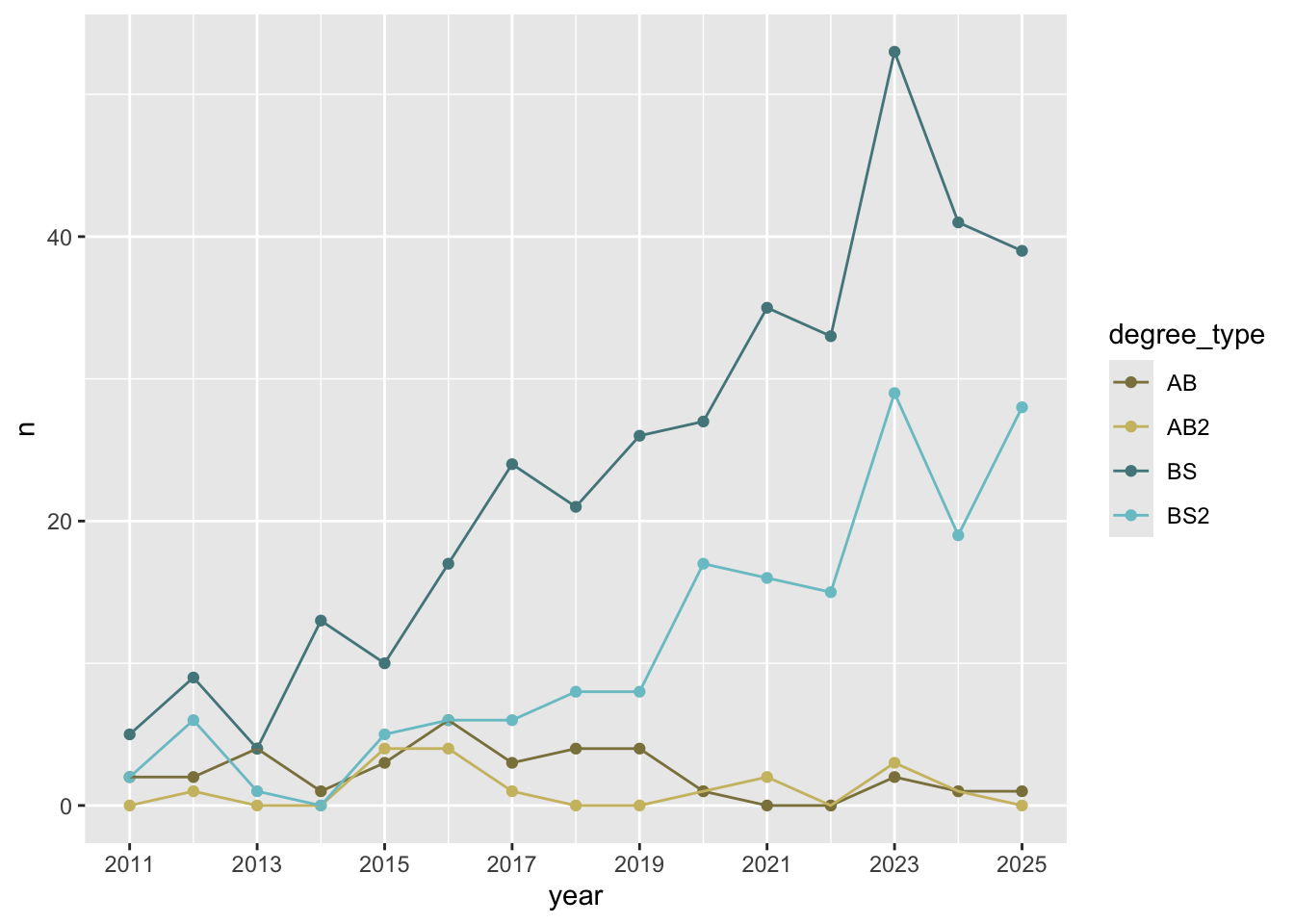 ggplot(aes(x = year, y = n, color = degree_type)) +