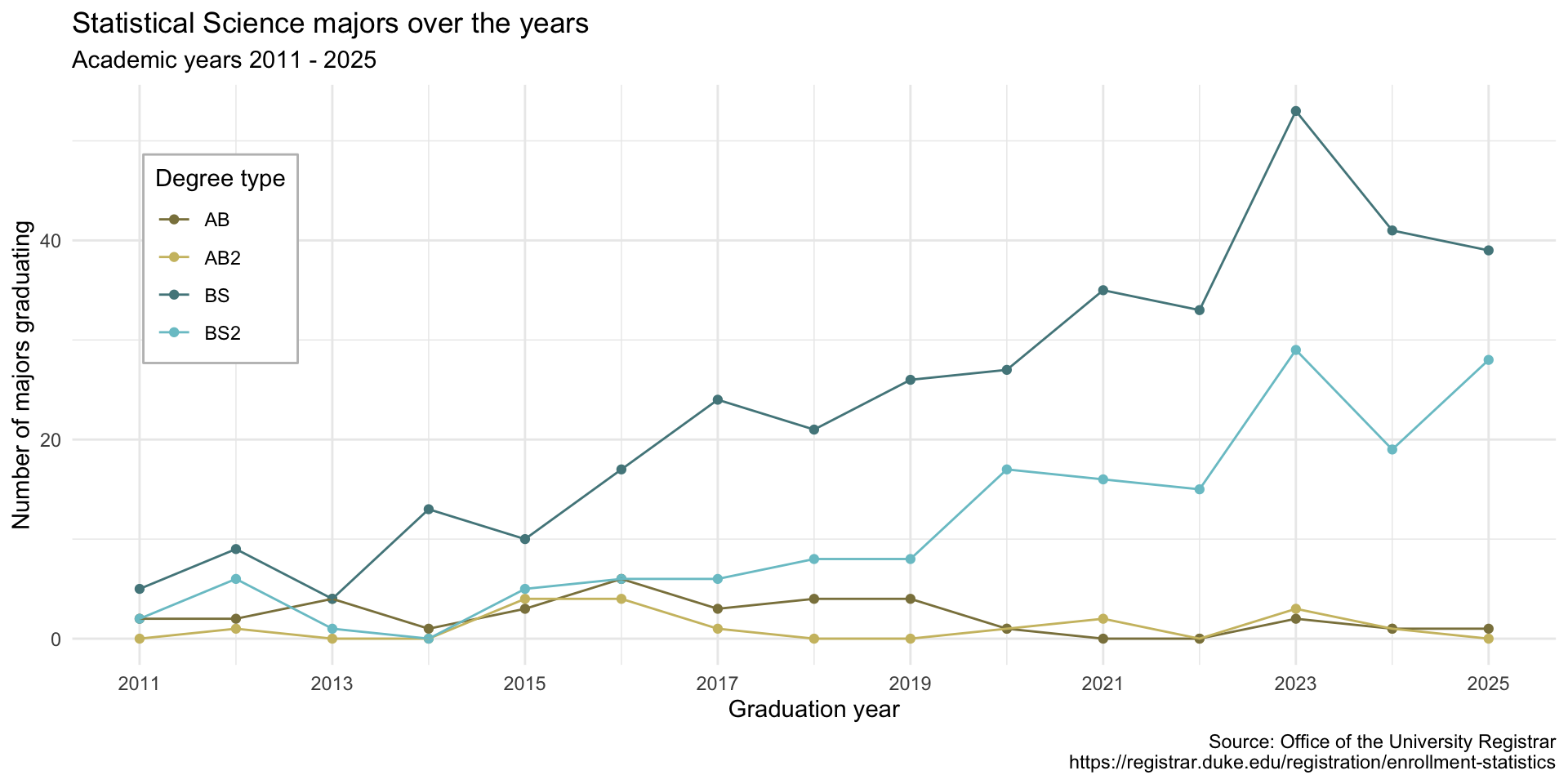 title = "Statistical Science majors over the years",