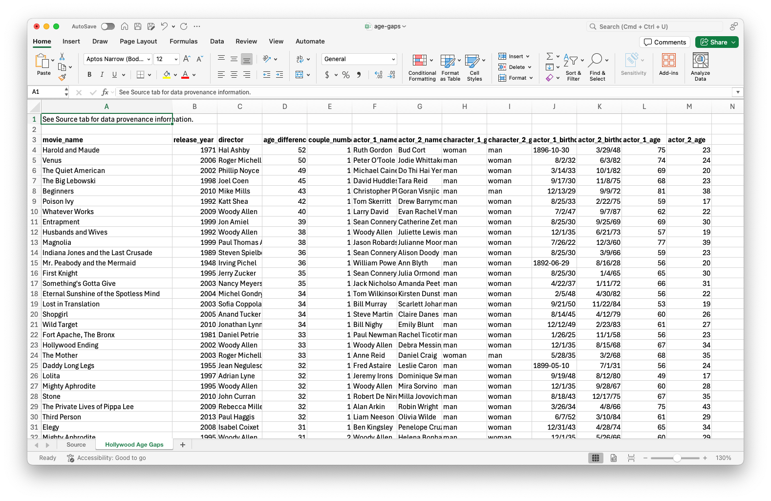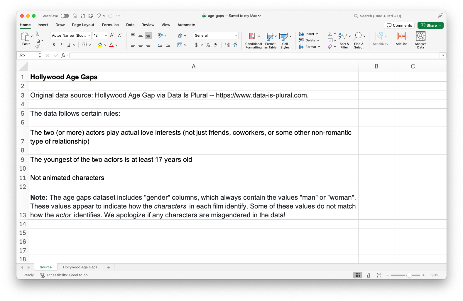 This is how the Excel file looks – it has two sheets, one with the data (called Hollywood Age Gaps) and one with information about the data (called Source). Additionally, the data sheet has some metadata at the top, above the column headers.