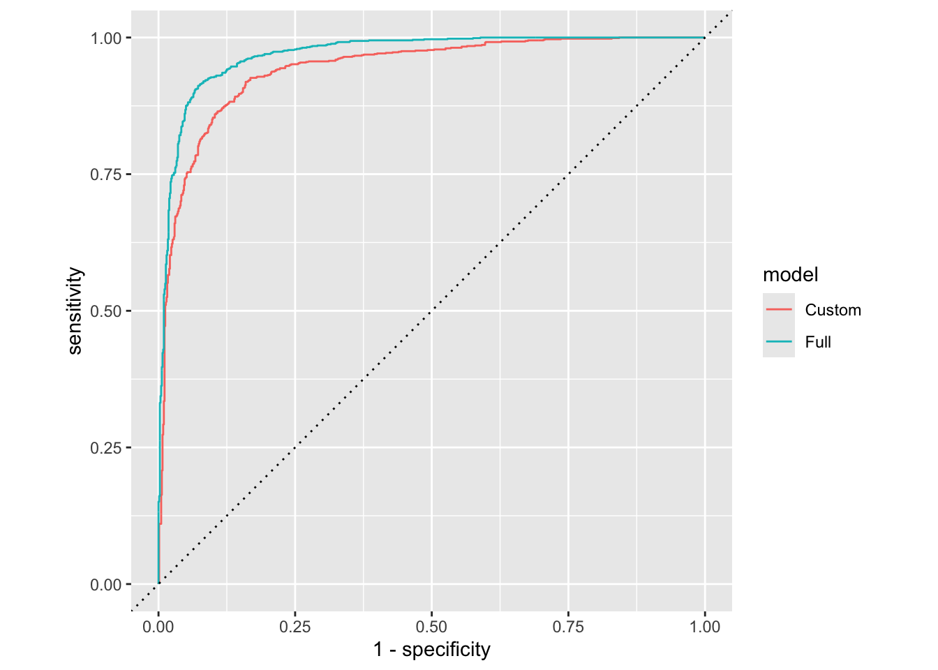 The full model looks better. We can quantify this comparison with the area under the curve: