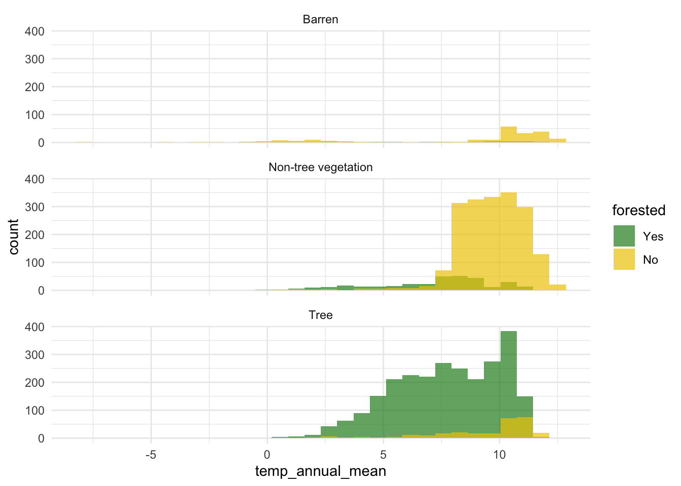 aes(x = temp_annual_mean, fill = forested, group = forested)