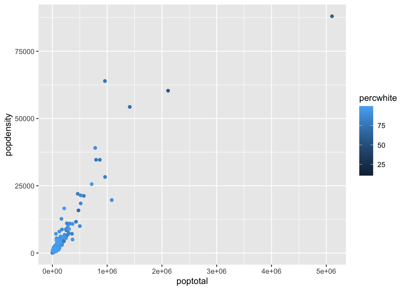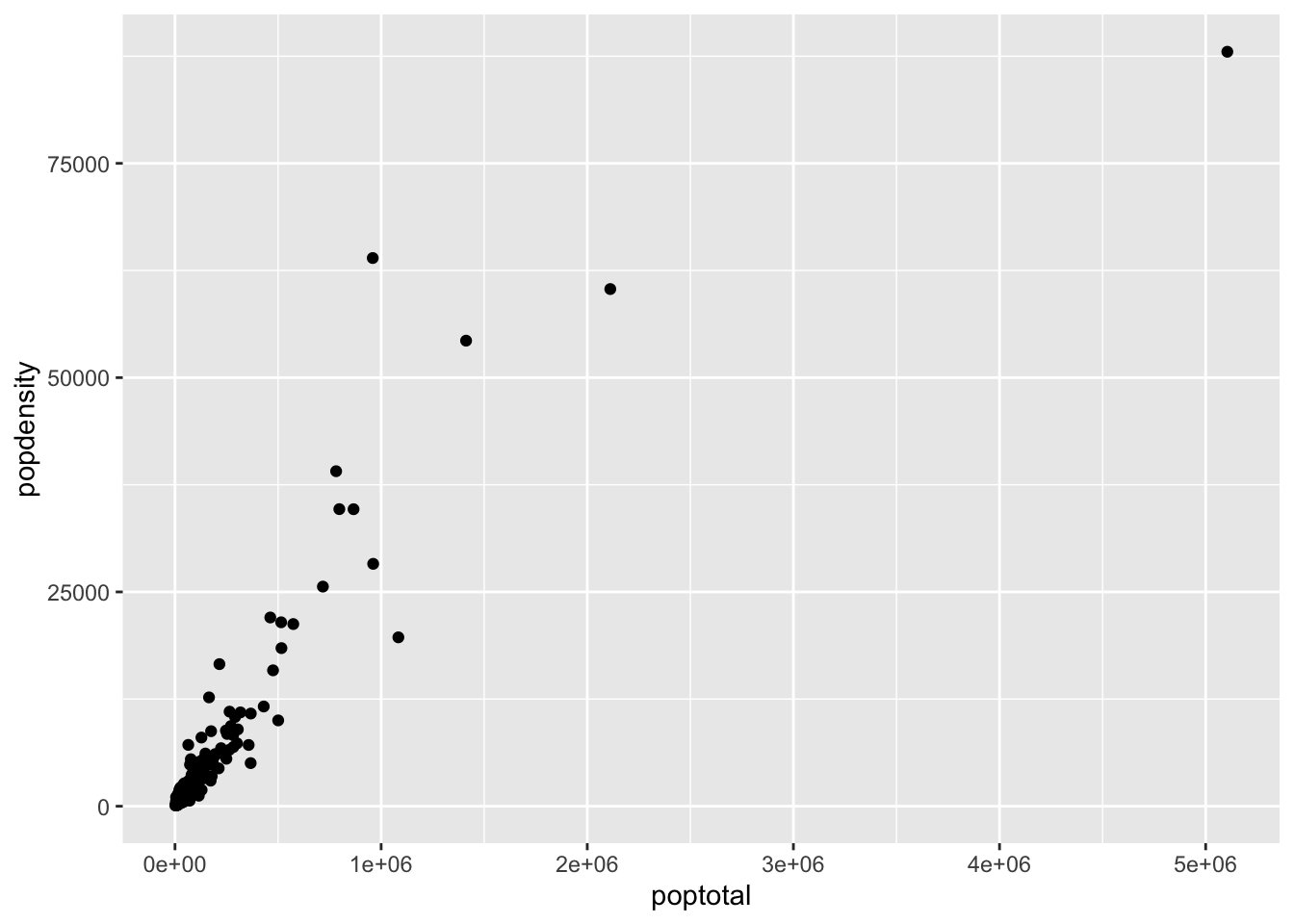 ggplot(midwest, aes(x = poptotal, y = popdensity,)) |>