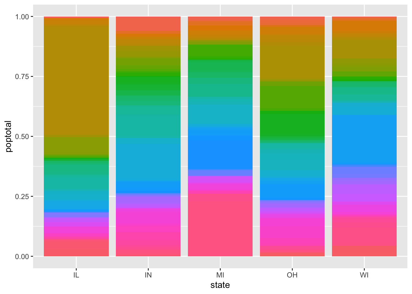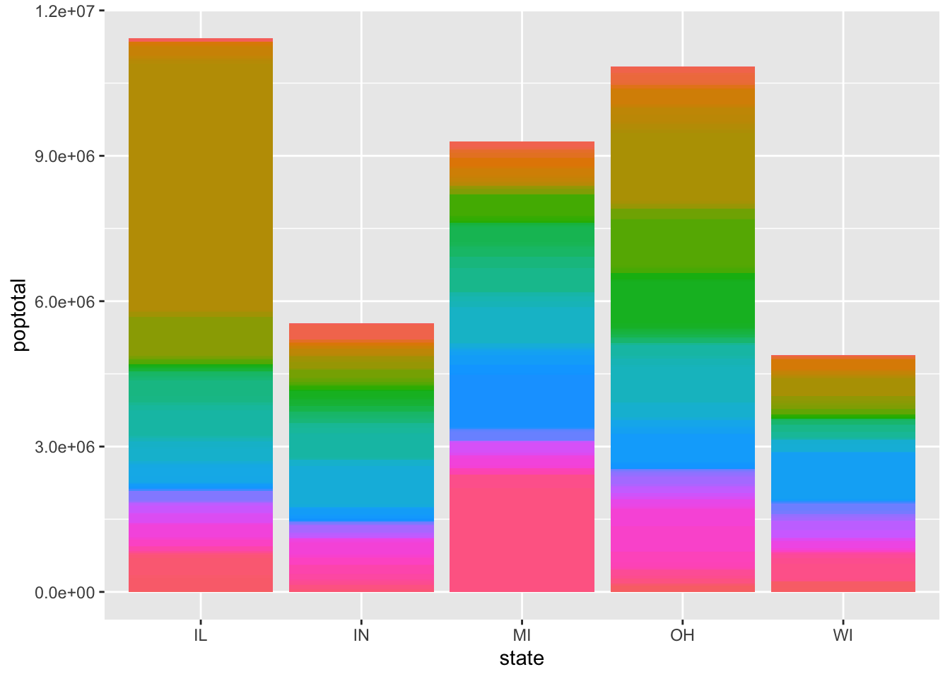 In this case, we can pass in x = state, y = poptotal, and fill = county without quotation marks, because R knows we are referencing columns in a data frame, which are actual objects in our environment. However, we pass in position = "stack" with quotation marks. To see why, let’s look at what happens when we drop our quotes: