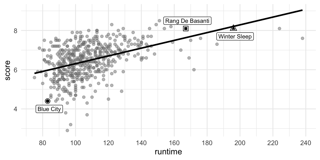 fit(score ~ runtime, data = movies)Figure 2 visualizes the relationship between score and runtime as well as the linear model for predicting score from runtime. The first three movies in Table 2 are labeled in the visualization as well. Answer all questions in this part based on Figure 2.