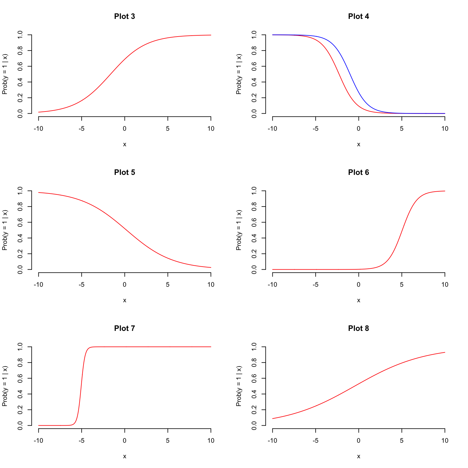In what follows, let \(y\) be a binary response, let \(x\) be a numerical predictor, and let \(z\) be a binary predictor. Match the S-curve to the model equation.