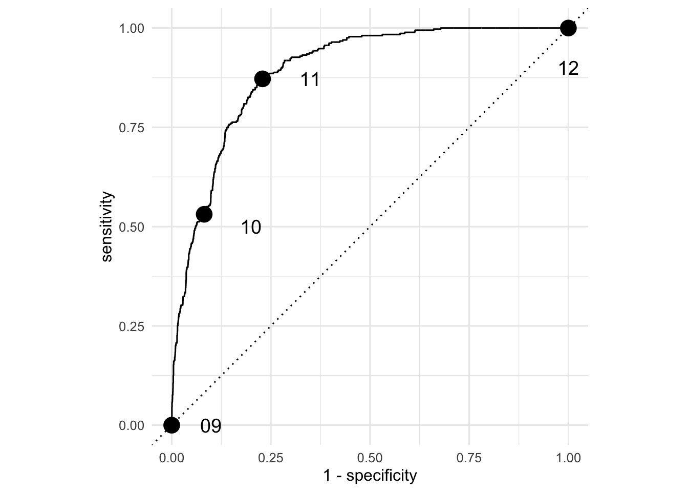 Match the point on the ROC curve to the threshold that was used to compute it.