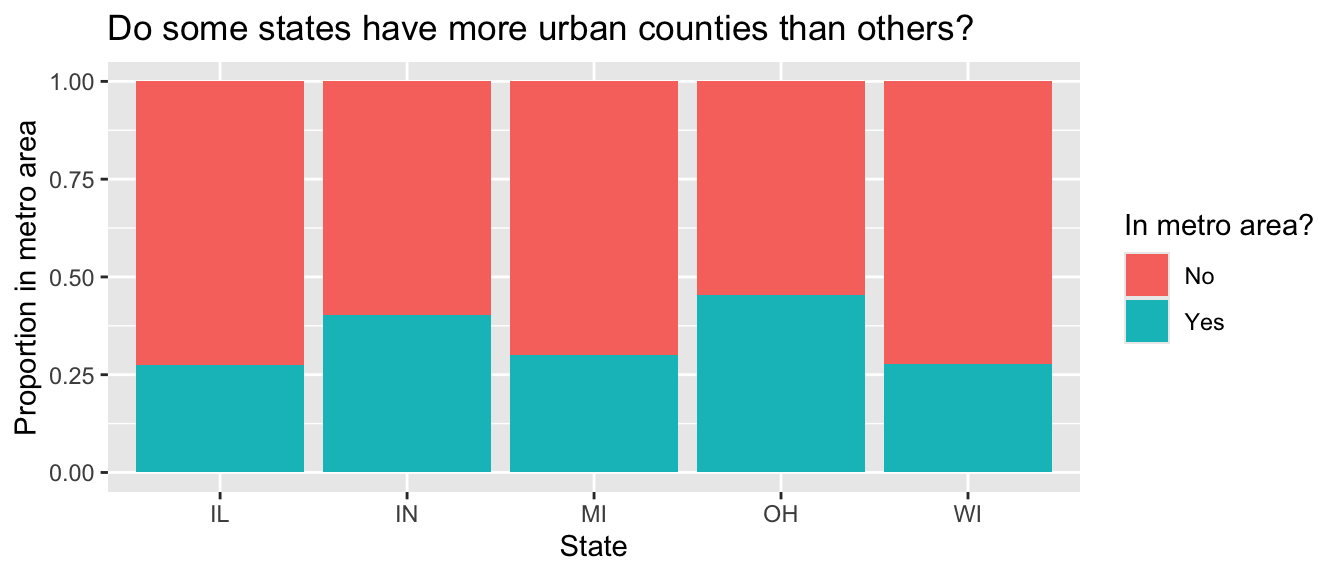 We will use the midwest data frame once again for this homework. The data contains demographic characteristics of counties in the Midwest region of the United States. Because the data set is part of the ggplot2 package, you can read documentation for the data set, including variable definitions by typing ?midwest in the Console or searching for midwest in the Help pane.