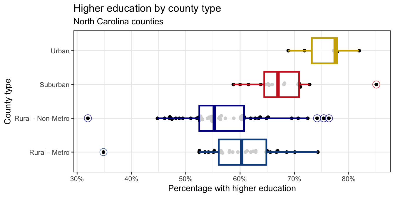 scale_color_manual()layer. You do not need to worry about the exact colors, but you should try to get close, e.g., use blue-ish colors for Rural counties, red-ish for Suburban, and brown-ish for Urban. You can use HEX codes for colors or look up named colors in R in the R colors cheatsheetTransparency: You should adjust the transparency of the box plots. You don’t have to worry about the exact transparency value, but you should try to get close.
