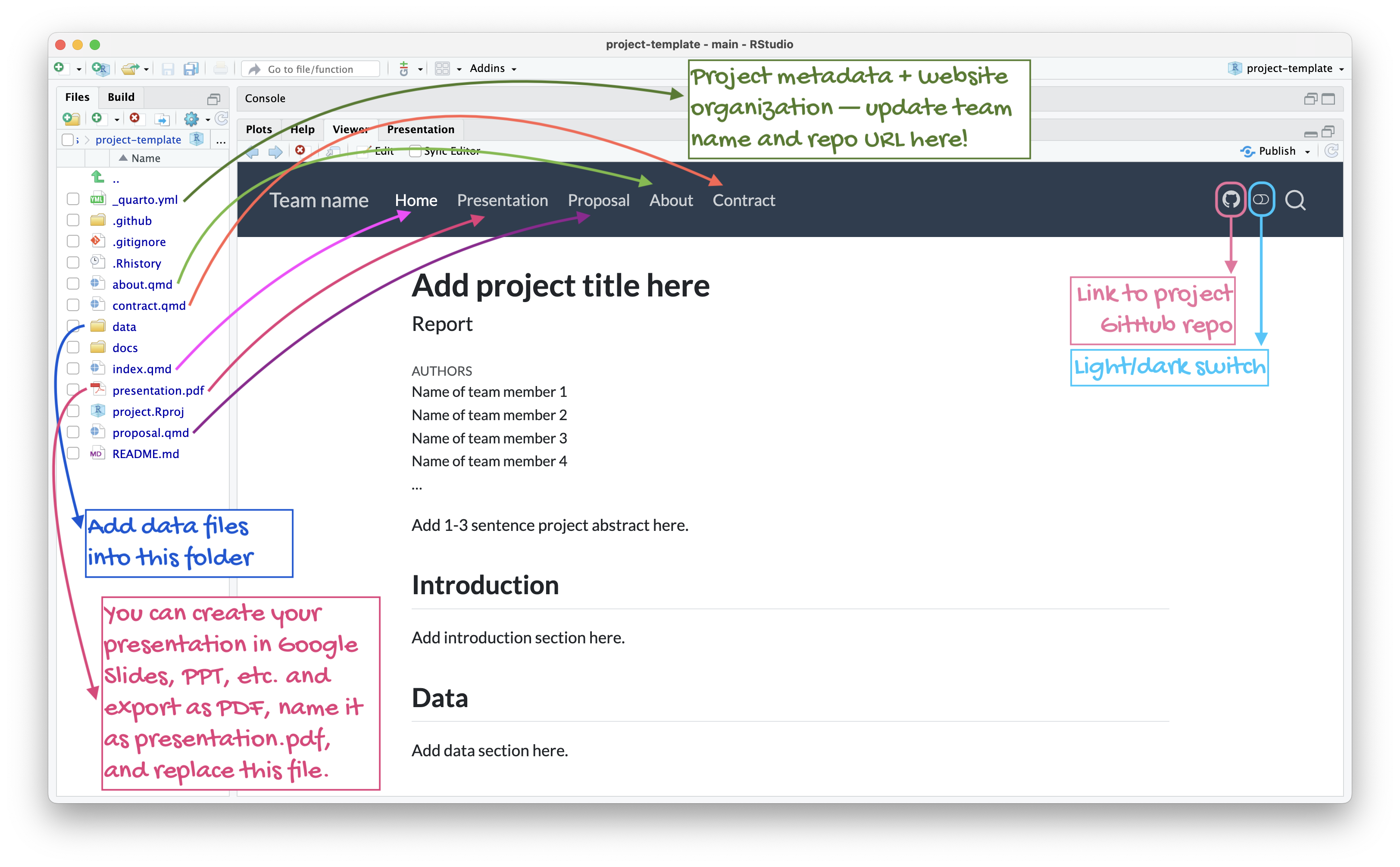 Your project is organized as a Quarto website, with a GitHub repository shared by all team members.