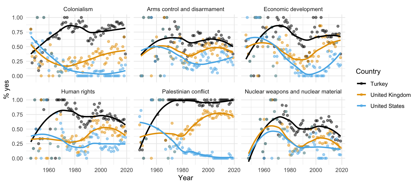 ggplot(us_uk_tr_votes, aes(x = year, y = percent_yes, color = country)) +