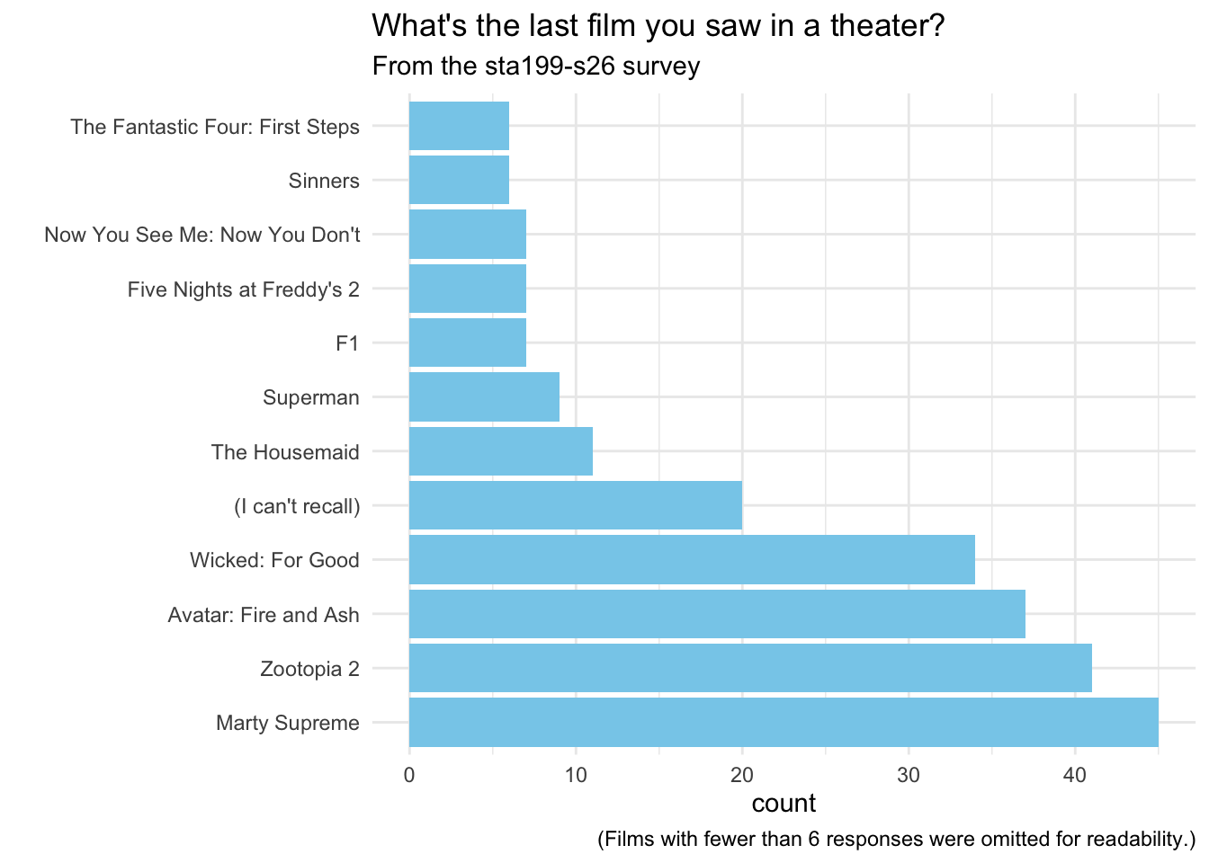 films |>mutate(Films =if_else(is.na(Films), "(I can't recall)", Films)) |>mutate(Films =fct_lump_min(Films, min =6, other_level ="Other")) |>filter(Films !="Other") |>mutate(Films =fct_infreq(Films)) |>ggplot(aes(y = Films)) +geom_bar(fill ="skyblue") +theme_minimal() +labs(y ="",title ="What's the last film you saw in a theater?",subtitle ="From the sta199-s26 survey",caption ="(Films with fewer than 6 responses were omitted for readability.)")