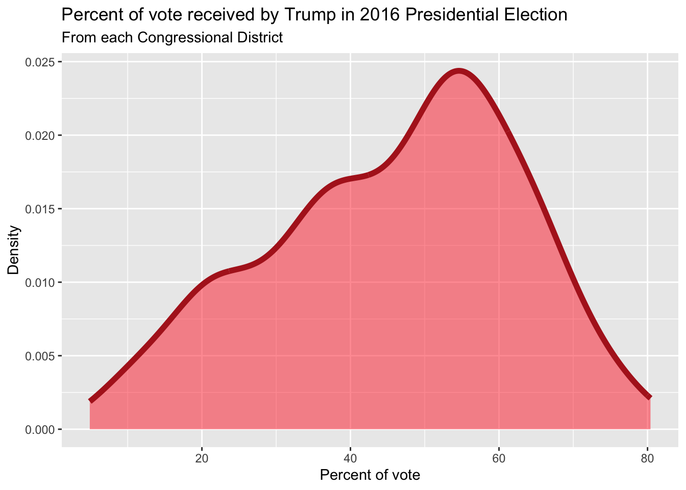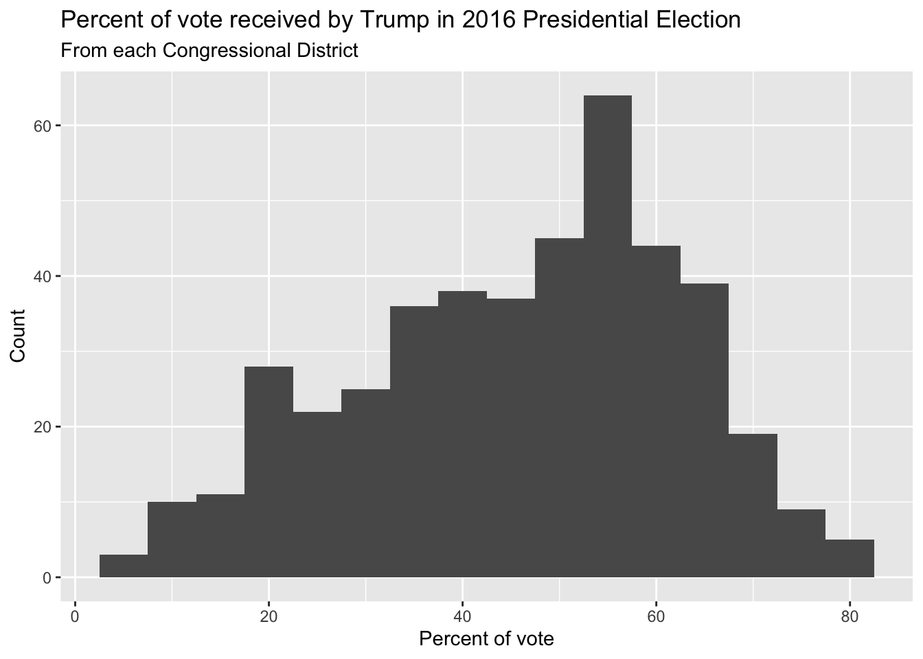 Shape: The distribution of votes for Trump in the 2016 election from Congressional Districts is unimodal and left-skewed.