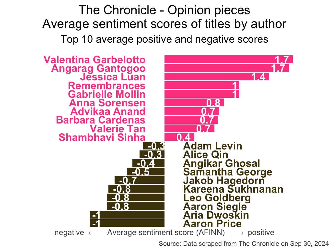 title = "The Chronicle - Opinion pieces\nAverage sentiment scores of titles by author",