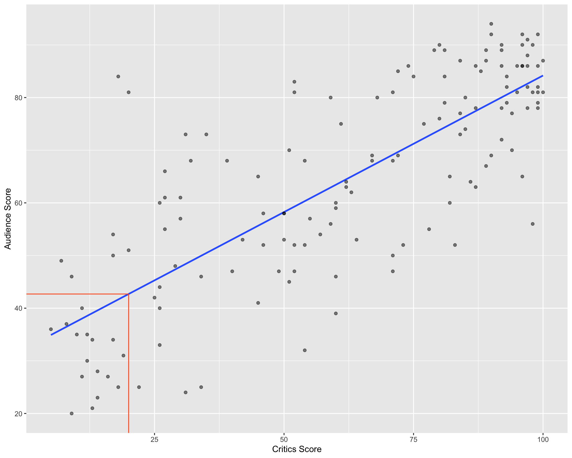 A new movie with a critic score of \(x = 20\) is released, and the model predicts that the audience score will be \(\hat{y}\approx 42.69\) on average: