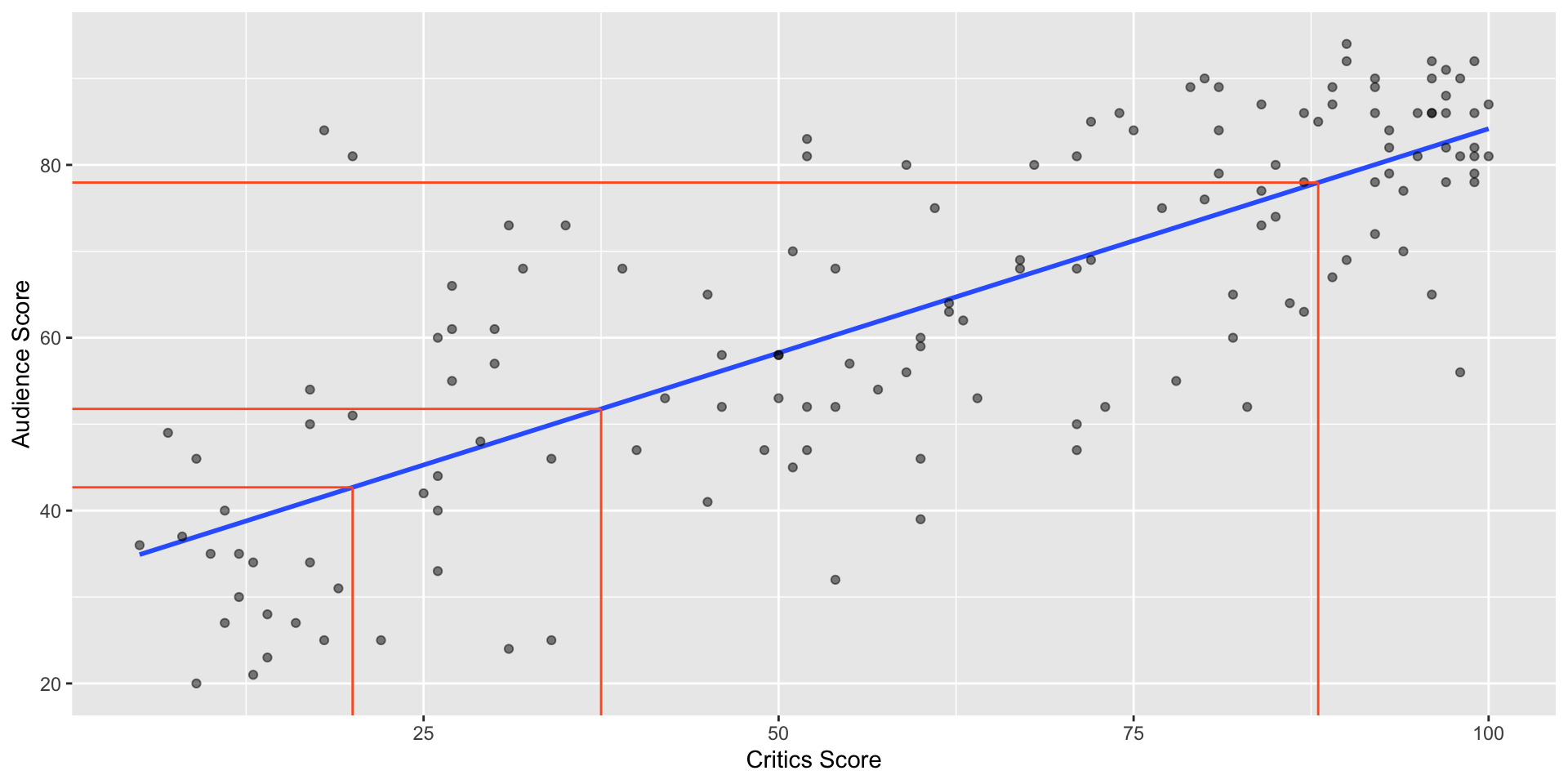 - For movies with an audience score of 0 points, we expect the critics score to be 0.519 points, on average.