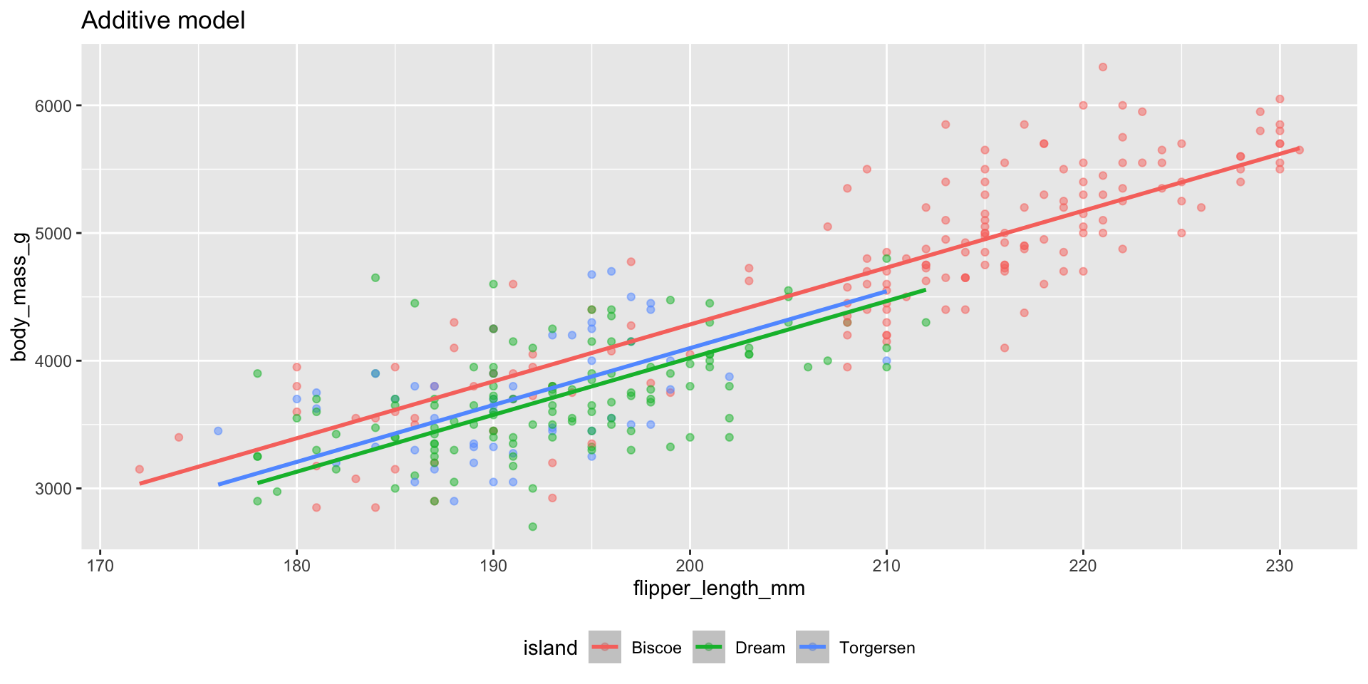 \[ \begin{aligned} \widehat{body~mass} = -4625 &+ 44.5 \times flipper~length \\ &- 262 \times Dream \\ &- 185 \times Torgersen \end{aligned} \]