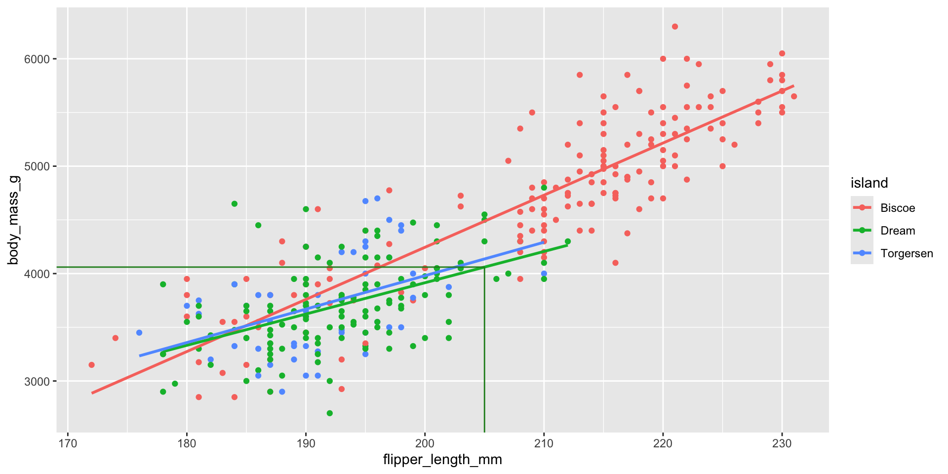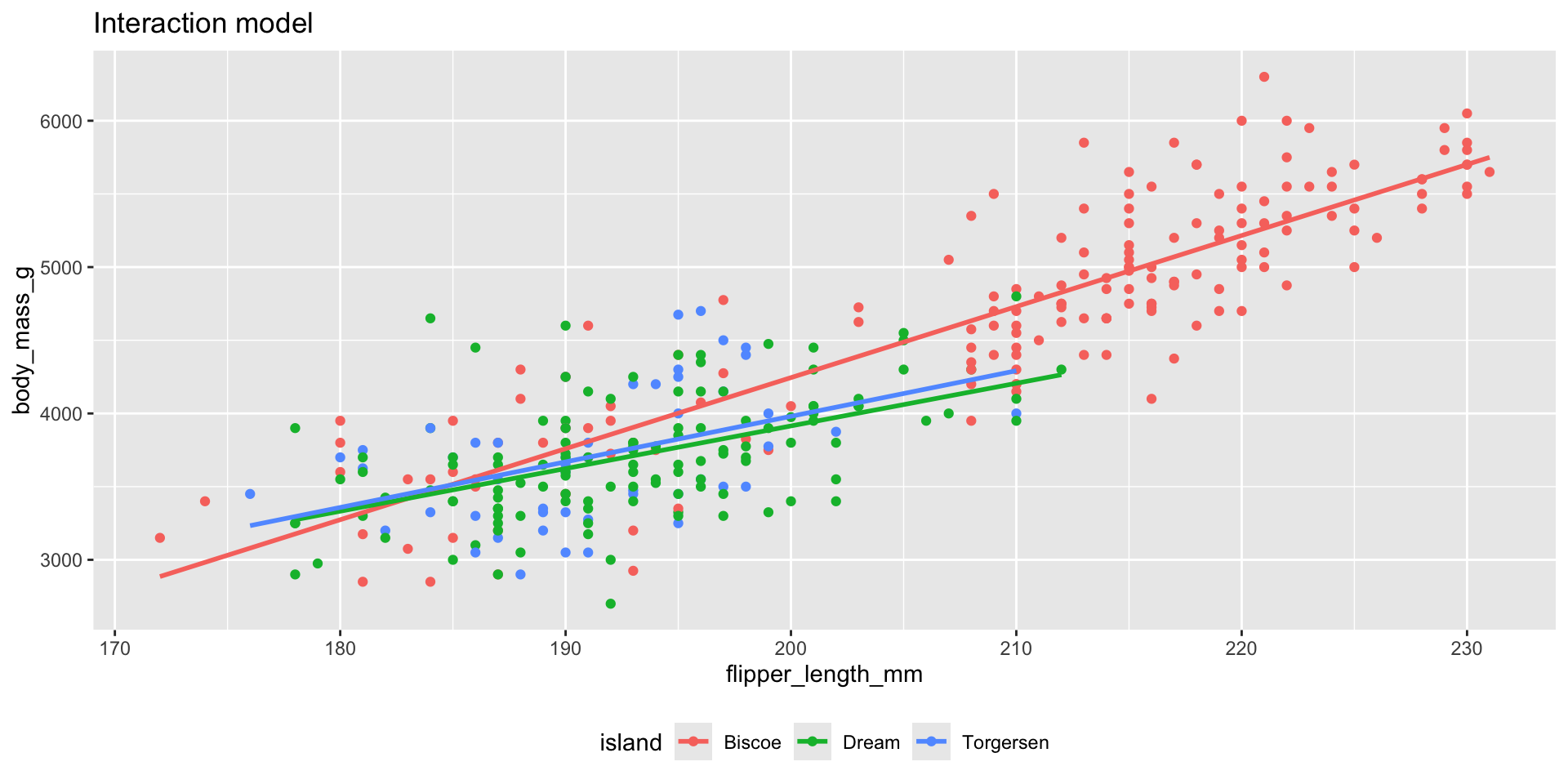 \[ \begin{aligned} \small\widehat{body~mass} = -5464 &+ 48.5 \times flipper~length \\ &+ 3551 \times Dream \\ &+ 3218 \times Torgersen \\ &- 19.4 \times flipper~length*Dream \\ &- 17.4 \times flipper~length*Torgersen \end{aligned} \]