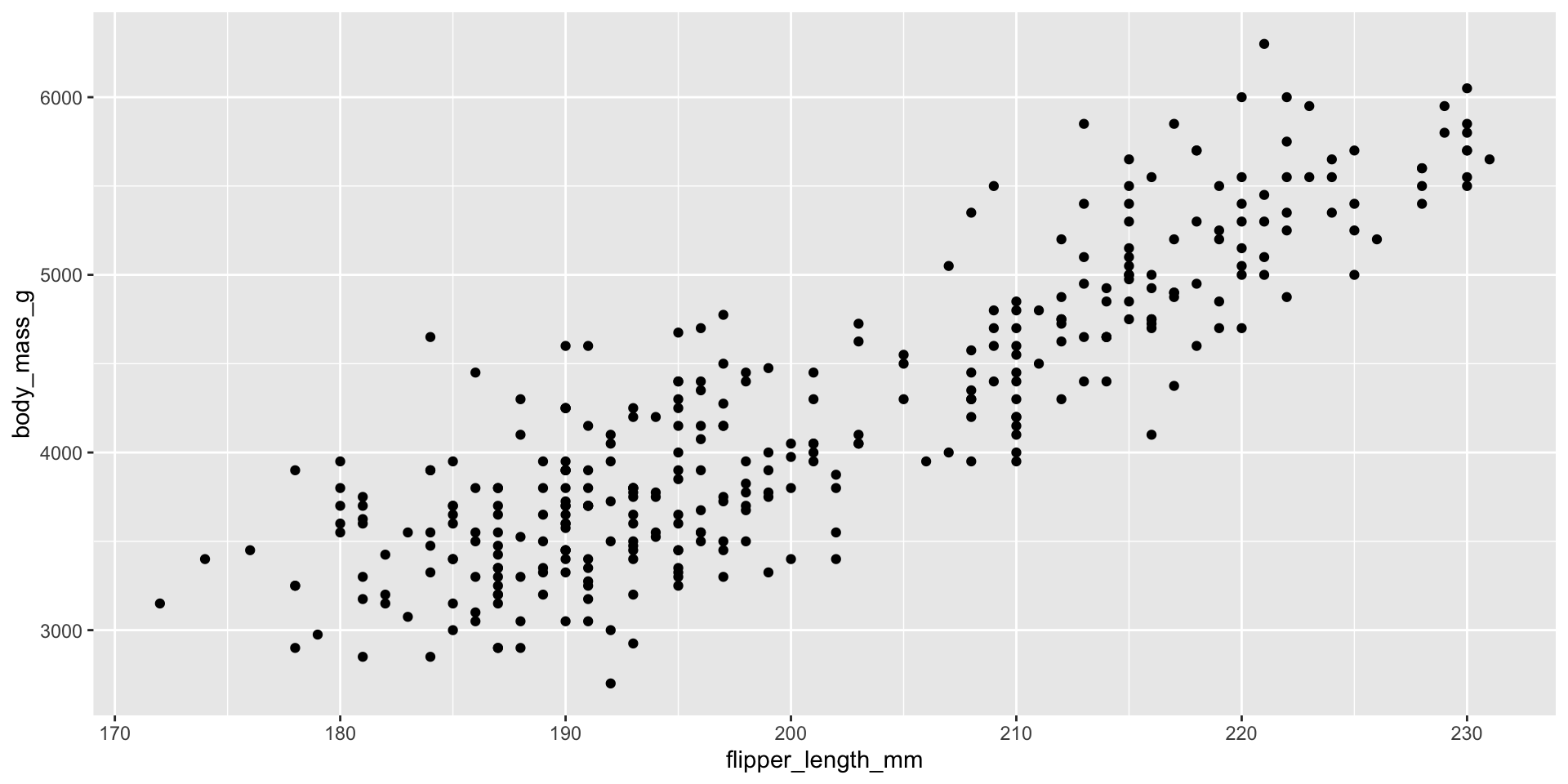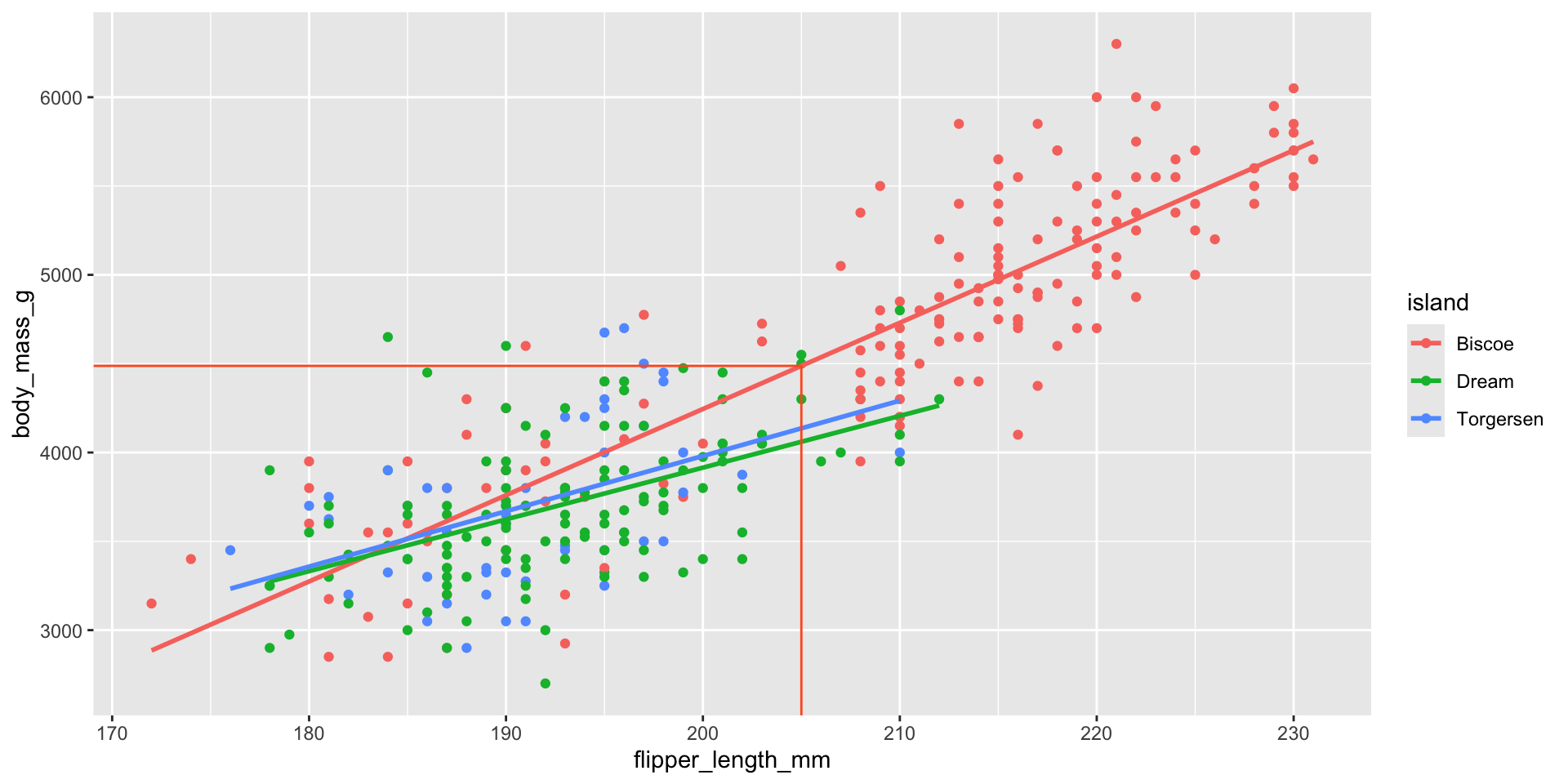 \[ \begin{aligned} \widehat{body~mass} = -4810 &+ 44.5 \times flipper~length \end{aligned} \]