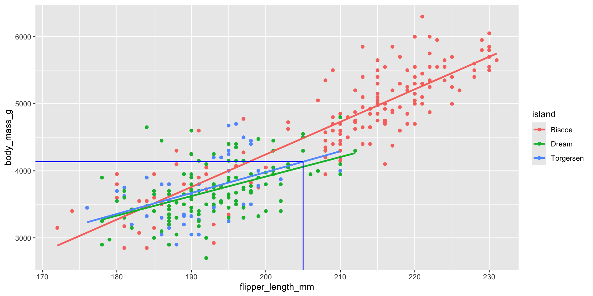 \[ \widehat{body~mass} = 4716 - 1003 \times islandDream - 1010 \times islandTorgersen \]