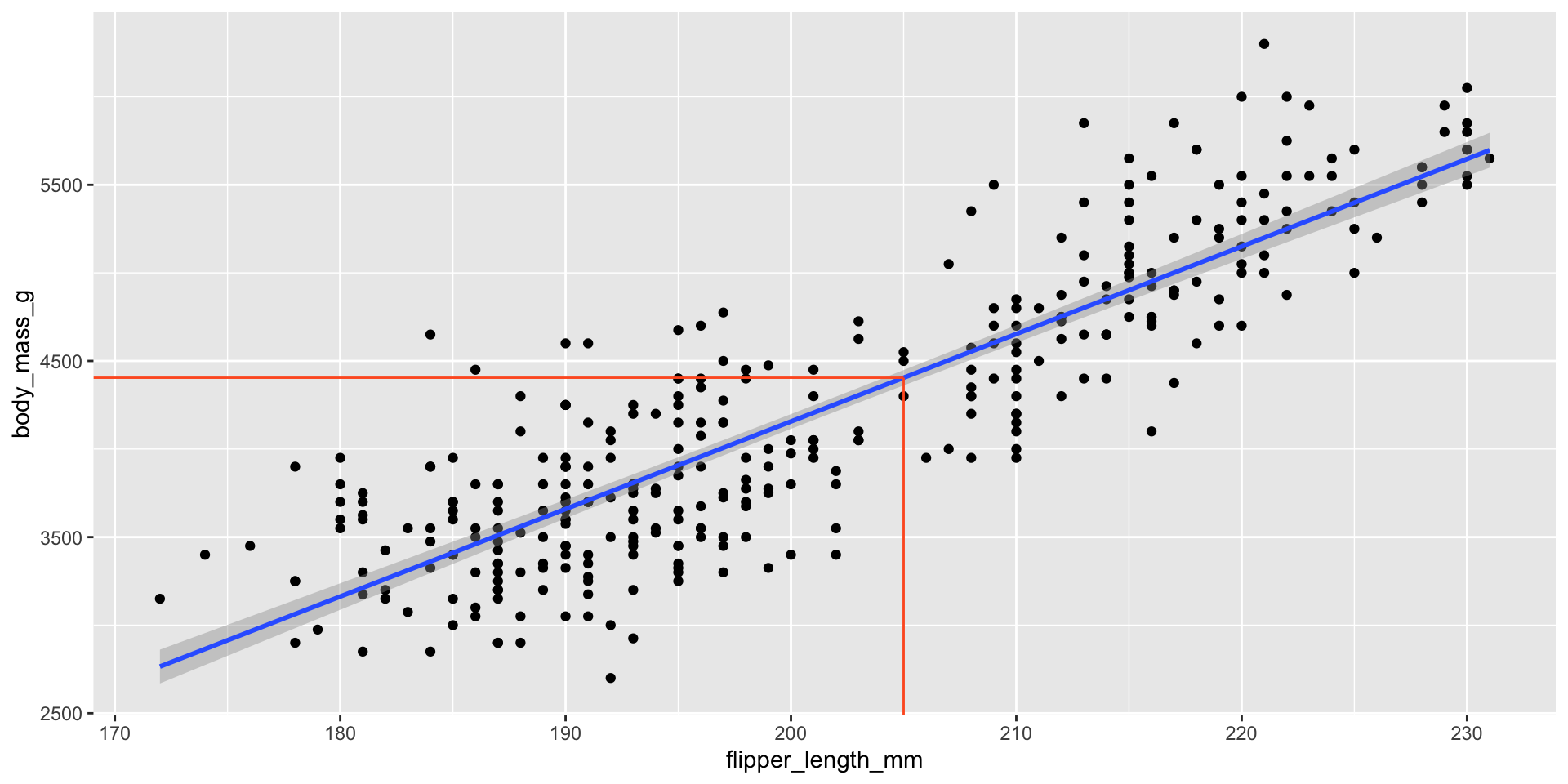 \[ \begin{aligned} \widehat{body~mass} = -4625 &+ 44.5 \times flipper~length \end{aligned} \]